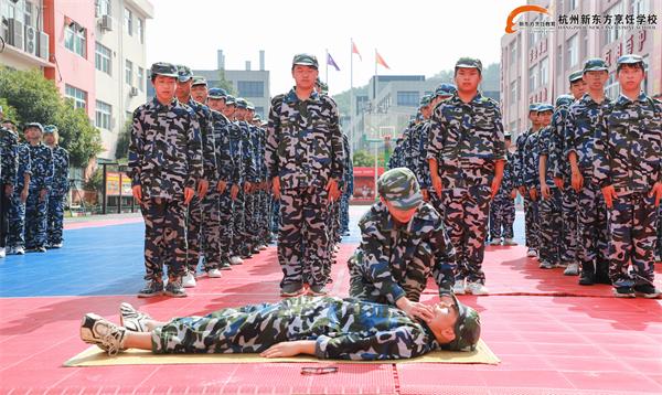 同学们以班级为单位组成方队,在教官的带领下,依次进行分列式汇报表演,接受领导的检阅。现场表演了军体拳、人工呼吸和胸外心脏按压急救术、灭火器使用技巧。他们的队列整齐,行动一致;他们的斗志昂扬,势如霹雳;他们出拳虎虎生威,踢腿凌厉有力;他们动作干脆利落,口号高亢嘹亮!他们将杭州新东方学子的精气神尽情展现,赢得了在场领导和老师们的阵阵掌声!